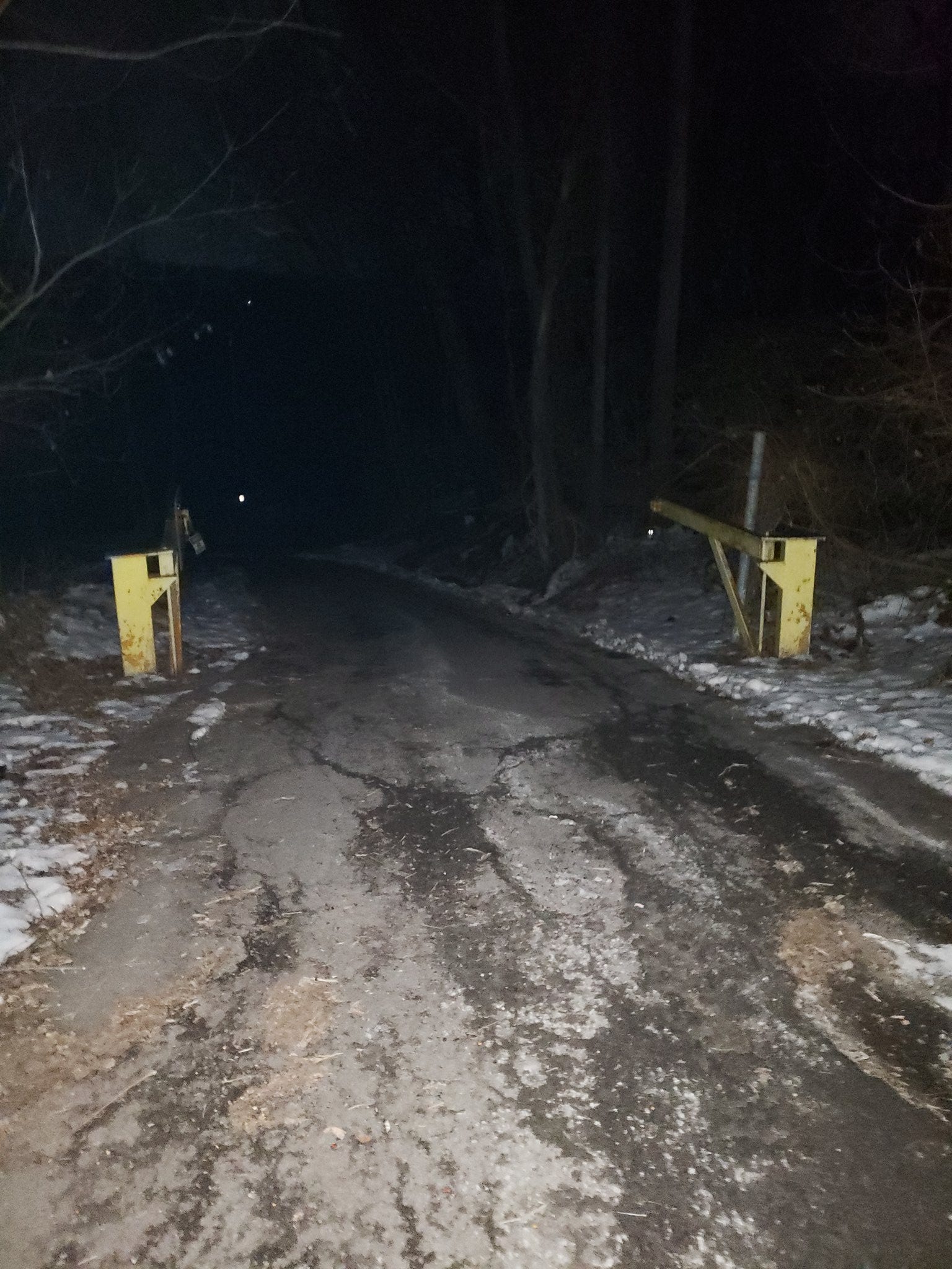 I did not stop to consider these things, at the time. I was of course aware that something had changed, that the walk had suddenly taken on an entirely different atmosphere. But I really did want to find some other way back than the way I had come – and anyways, a road like this is enticing to me, so narrow, so drenched in darkness, and dropping so steeply you can hardly tell it’s there until you’re right on to of it. The experience of walking on a road like this was one I wished to know, and so I pressed onwards. I passed a yellow swing gate that hadn’t been closed, it looked like, in a very long time. Beyond it, the light from the streetlights behind me quickly faded into almost nothing, and there were none to be seen up ahead. I moved cautiously; the road really was abnormally steep, and it was too dark to tell for sure what might be a patch of ice. Around me there was only the sound of my own scraping footsteps, of the rushing water, still near, only growing louder, of cars passing on the road I had left behind me and on another somewhere distantly ahead, very distantly, echoing across the gorge, and of the wind whistling now and again in the branches of the barren trees. I tried for a few feet to make my way in the darkness, before doing the obvious, sensible thing and turning on my phone’s light. I’m not sure why I hesitated at all – perhaps because admitting the necessity of the measure was implicitly admitting, as well, that what I was doing no longer really fit the parameters of a casual after-dinner stroll, or perhaps because I simply didn’t want to draw attention to myself. In any case, the light seemed strangely feeble to me, more so than I was accustomed to, like something about the place was somehow smothering it. At one point, I raised the light up to try to look around, and it reflected off… something, a sheet of metal maybe, in the back window of a house I hadn’t realized was there until just then. After that, I kept it pointed at the ground.