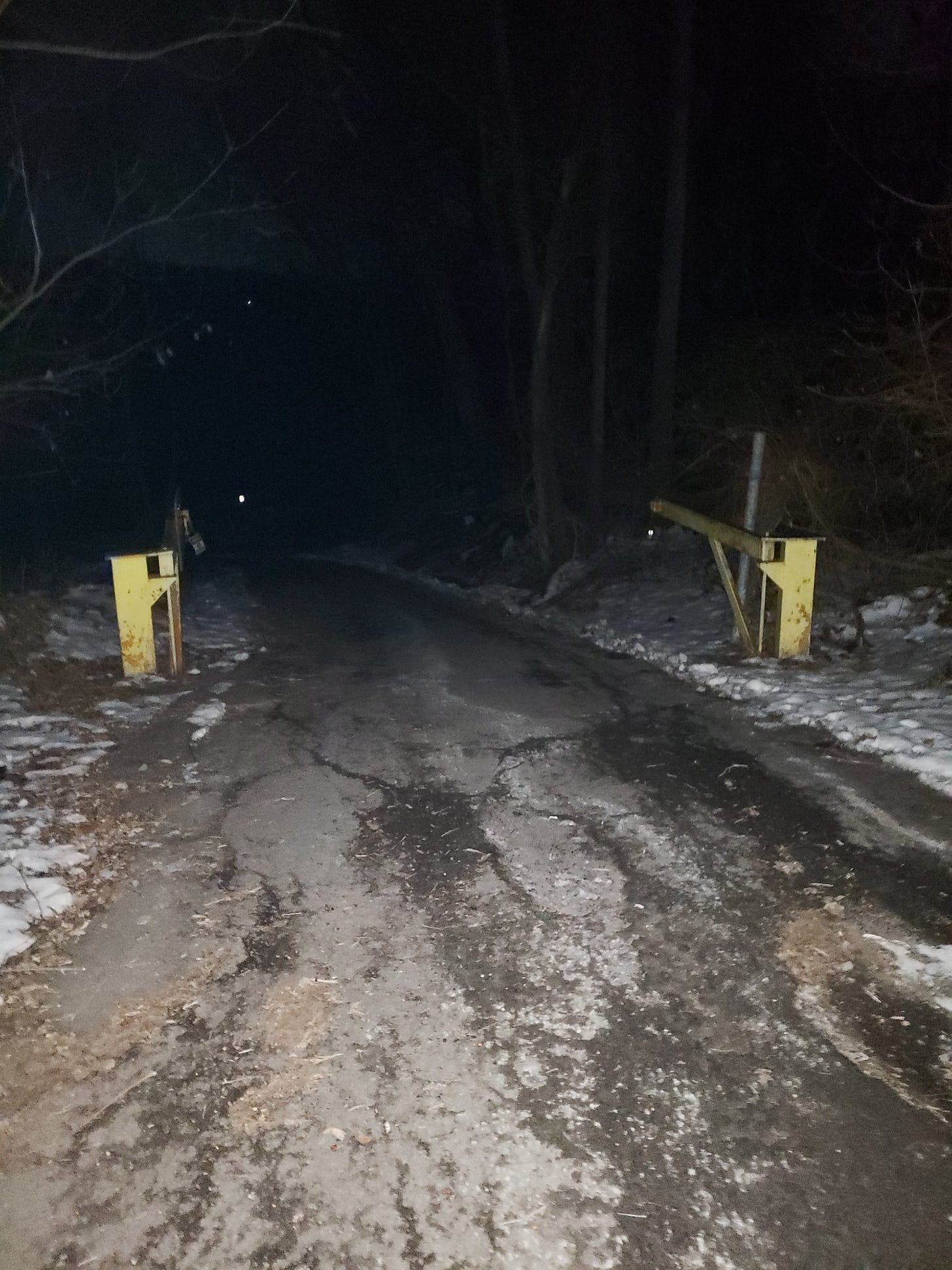 I say “after that,” but there really isn’t much more to tell. I kept walking a little further – it turned out there was no ice on the road, luckily, just some damp patches. It had curved sharply towards the gorge, and I started to think it might be an access road of some sort. I could see it curved again further on and kept going the direction it had begun in, presumably linking up with the house I had seen at some point, but it seemed increasingly unlikely it was actually going to lead where I was trying to go. Registering this, I stopped and looked around. In the daytime, in the summer, I imagined it was probably quite a picturesque spot, but at night, in the winter, it felt eerie and forgotten, secluded in a bad way. The thought occurred to me, as well, that there could easily be someone sleeping rough in an out-of-the-way spot like this – I wasn’t really worried about being jumped (well, maybe a little; I am no more immune to bourgeois afflictions than you are), but I was aware of how threatening I might seem to them, if there was anyone there, a young guy in dark clothing walking alone in a place no one would really be expected to have any wholesome business being this time of evening, and I wouldn’t want to be the cause of any lost sleep, or worse. The overriding feeling, to put it simply, was that I was in a place I should not be – not at this time of day, at least, at this time of year. It wasn’t an urgent feeling, I wasn’t scared, there was no fight-or-flight impulse; I just simply felt I shouldn’t be here, that it would be foolish to try to go any further, and that lingering certainly wouldn’t do me any good. And so I didn’t. I turned around, and I climbed back up the road I had just walked down. On my way out, I stopped and took a picture of the gate I had passed through: