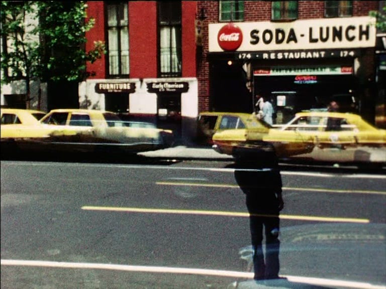 I watched a film called Still recently, which was shot in 1971 by Ernie Gehr, one of American cinema’s great formalists. Still is a fifty-four minute film in which a series of multiple exposures are made on a series of rolls of film, all of the same ordinary street scene, a view of Lexington Avenue across from the offices of the Film-Makers’ Cooperative, where Gehr was working at the time. These exposures are made from an identical camera position (except in one case, where the camera has been tilted slightly upwards) but at different times of day, meaning the setting of the scene (the street, the sidewalk, the restaurant across the way) remains the same, but the participants in this scene (the people, the traffic, the shadows cast by the sun) do not. This creates interesting, at times surprising optical effects, such as ghostly pedestrians walking by in perfect alignment with the very definitely solid ground, or cars parked on the other side of the road which appear to hover in front of passing vehicles. There is a moment where a man crossing the street seems to move both between and “through” some parked taxi cabs simultaneously. Aside from the first two, shorter rolls, which are silent, sound was recorded as well, capturing traffic noises, snatches of conversation, everything you would expect of the hustle and bustle of 1970s New York, which adds a further layer to the experience. In one of the later sequences, not quite at the end but approaching it, one can hear, in the distance, what sounds like a woman screaming – she shrieks once, and then, a few minutes later, once again. There’s no payoff for this, no explanation. The street looks the same as ever. No one seems to pay it any mind. And, of course, why would they? If you’ve ever lived in a large city, you’ll know these things happen all the time. To the extent that the event is notable at all, it’s notable because it was recorded, recorded in the course of creating something that people are still interested watching in 55 years later, after almost everyone depicted, one can’t help but be reminded, has very likely died. Gehr hasn’t, it’s true, but he was still quite young when he made this (about the same age as me, in fact, something I didn’t realize until I looked it up, and which now makes me feel very strange), and he certainly isn’t anymore. He’s part of the old guard now. We’re lucky to still have him around.