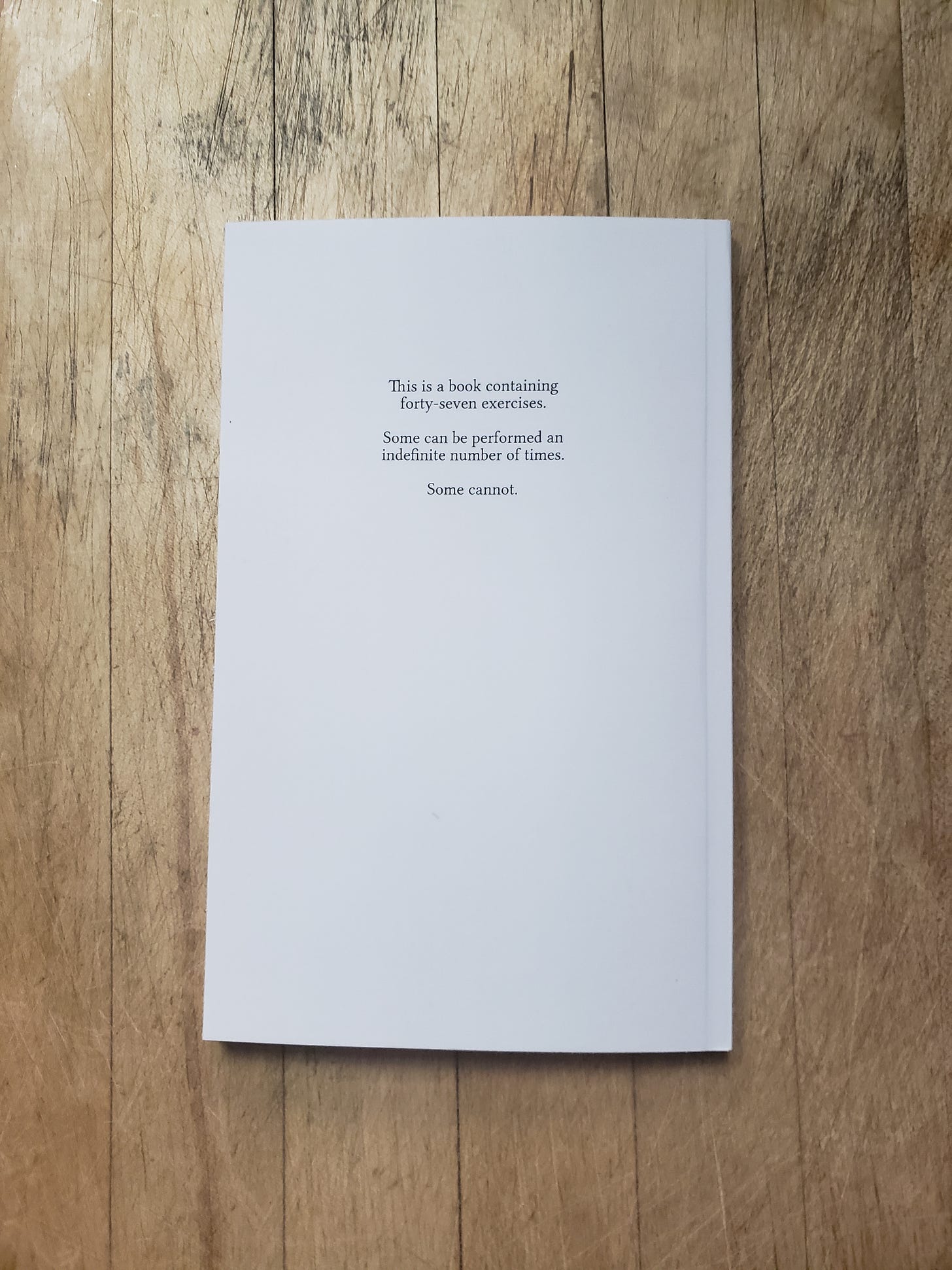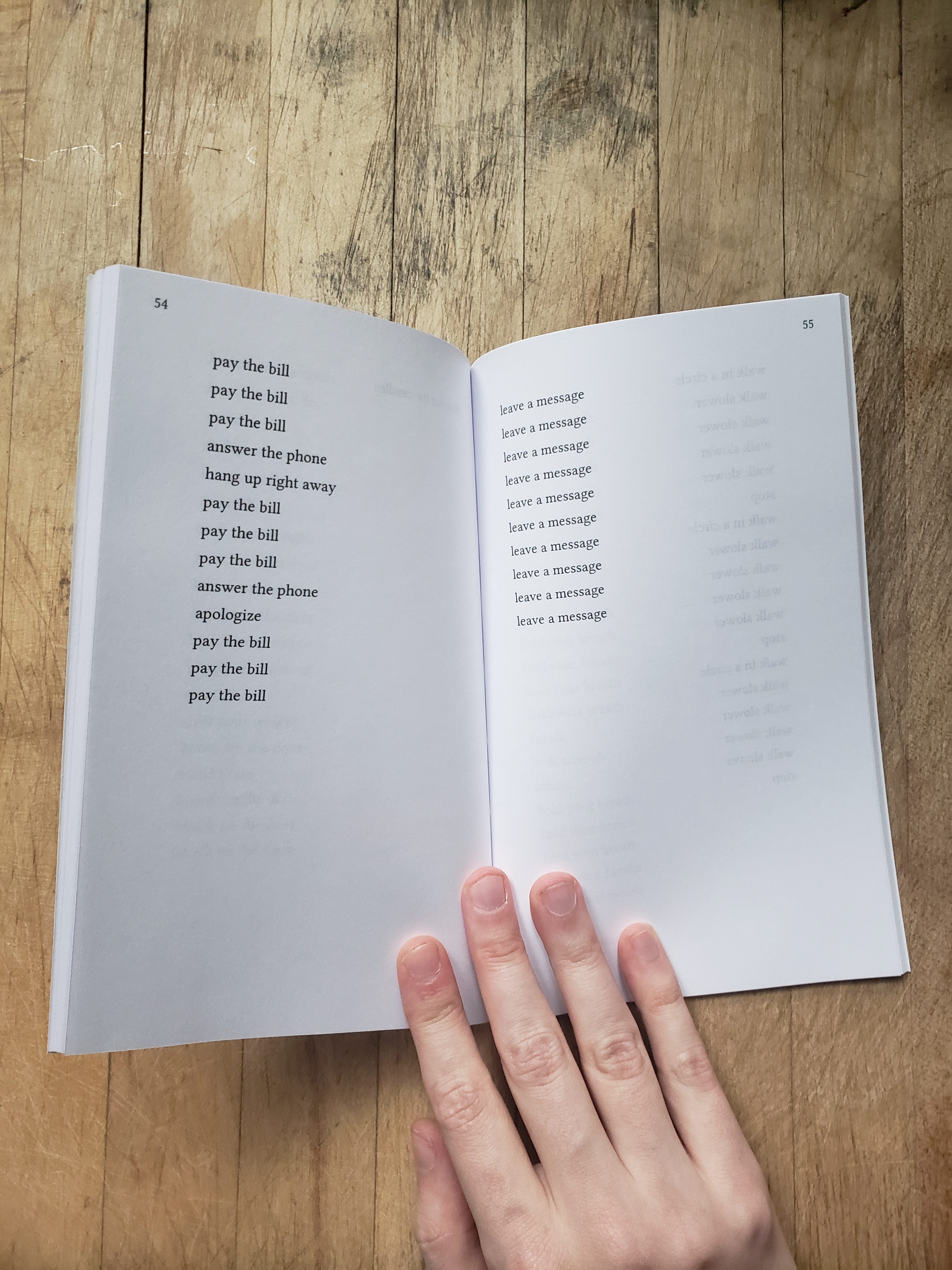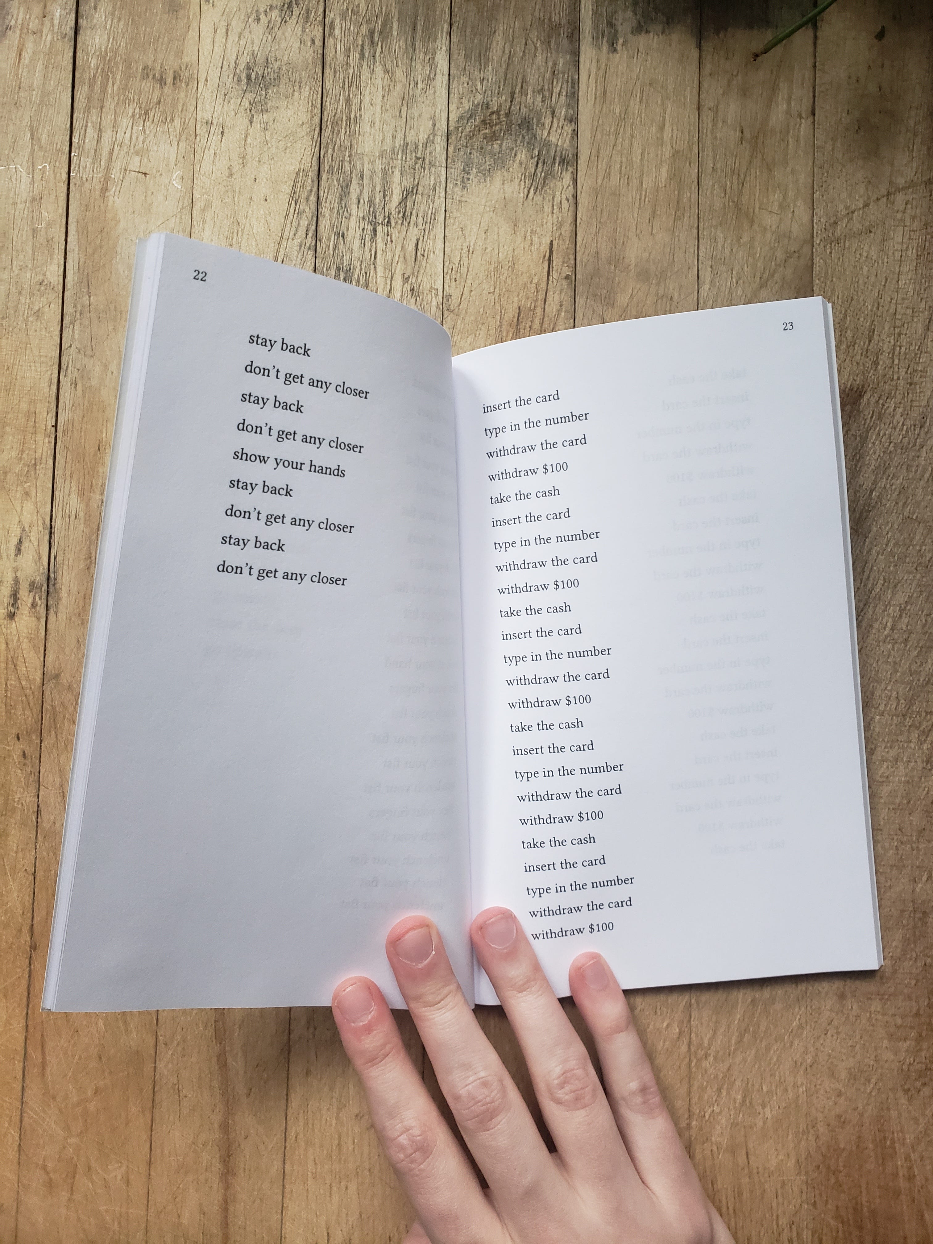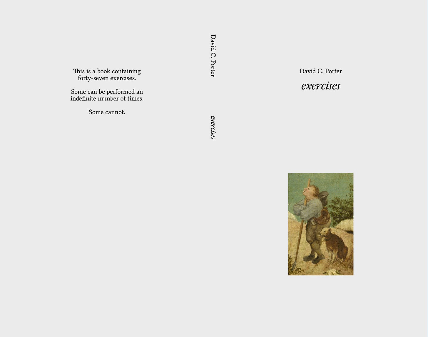 exercises is distinct from these in that it’s significantly longer, but similar in that it’s more or less entirely focused around the development of a single formal/conceptual conceit – in this case, that of a repeating sequence of written instructions for physical actions, or an “exercise.” I wouldn’t call these sequences poems, exactly, but I would say they are something adjacent to it. While some of them describe essentially ordinary, mundane activities, some are much stranger, more disquieting, drifting into fraught psychological territory or intimations of surreal violence. The language, furthermore, has been pared back to a minimal level of bare functionality, equally cold and mechanistic regardless of what it seems to describe. Not to insist too strongly on the relevancy of a work of experimental literature, but I feel it’s become routine, in these ever-darkening times, when it seems no one can agree on what constitutes an apocalypse, and whether or not you’ll still have to go to work during it, for many people to spend large portions of their lives in a state of low-level dissociation, “running on autopilot” is one way you’ll often hear it described, and I think these sequences speak to this condition quite pointedly.