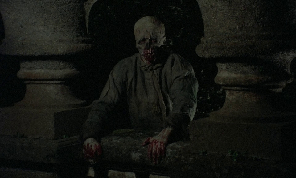 Burial Ground is an Italian production from the near the tail end of the period where Italy was producing some of the most remarkable and groundbreaking horror cinema in the world. If you’re reading this, you’re probably at least vaguely aware that this moment was defined, arguably, on the one hand, by directors like Bava, Argento, or Fulci, who were genuinely brilliant artists, and who found ways of making commercial horror cinema into a vehicle for the exploration of their own personal obsessions and perversions, and, on the other hand, by directors like D’Amato, Mattei, or Lenzi, who were not genuinely brilliant artists, but were completely unapologetic sleaze-peddlers, and who also tended to cram their horror films with weird perversions, because weird perversions sell. I am laying out this schema because I think it’s important to understand that Andrea Bianchi belongs unambiguously to its second category, to the sleaze-peddlers. If you have heard of him for anything other than this, and you’re not a serious connoisseur of Italian sex films, it would probably be the giallo Strip Nude for Your Killer or the gangster flick Cry of a Prostitute – I haven’t seen either of these films, but I’ve heard of them, and I could see myself watching them one of these days, which is not nothing. Beyond that, it’s a pretty uninspiring list of credits, to put it bluntly. I’m sure his deeper cuts have their moments, but I think that’s all you could reasonably hope for, in choosing to watch them: moments, and nothing more.