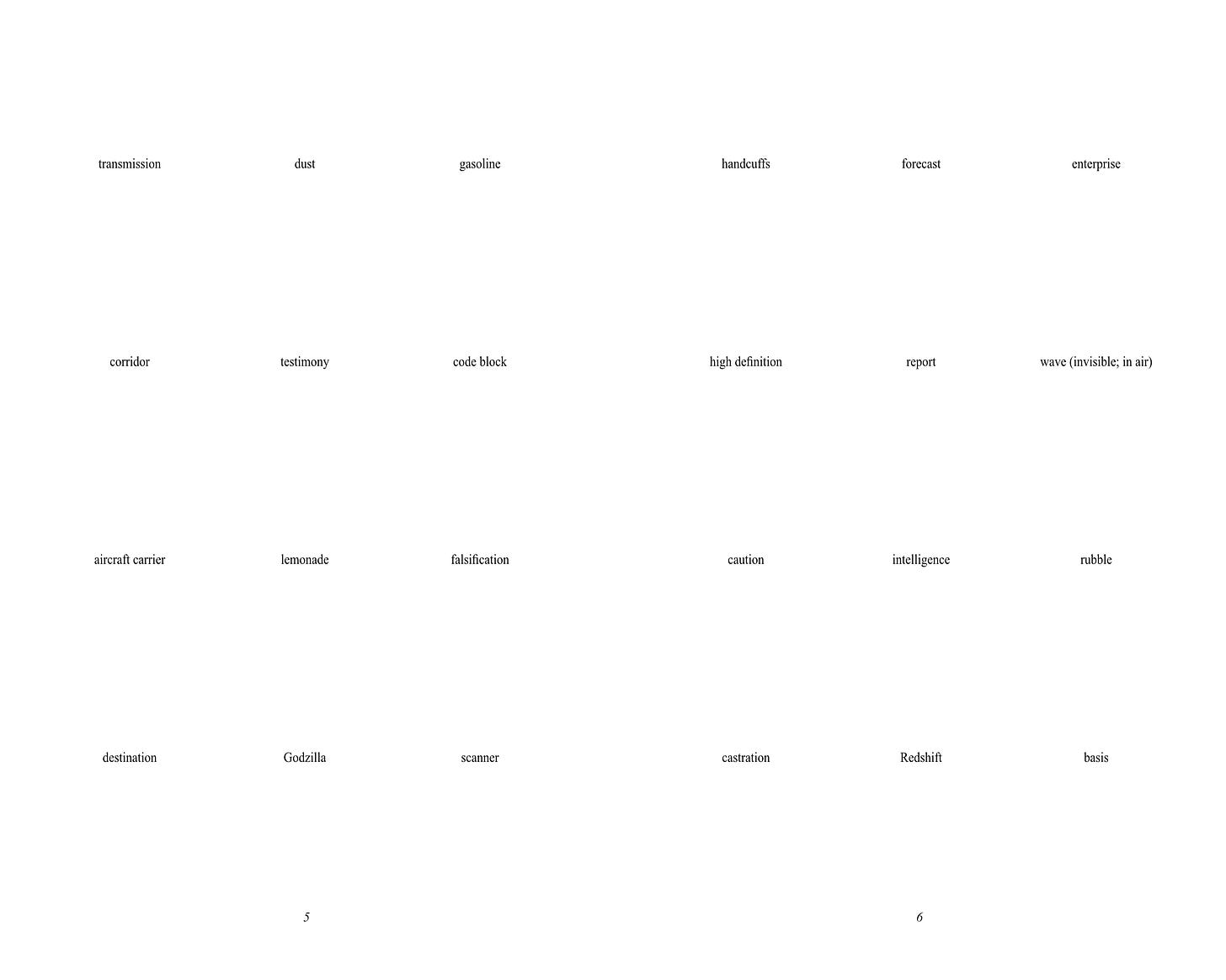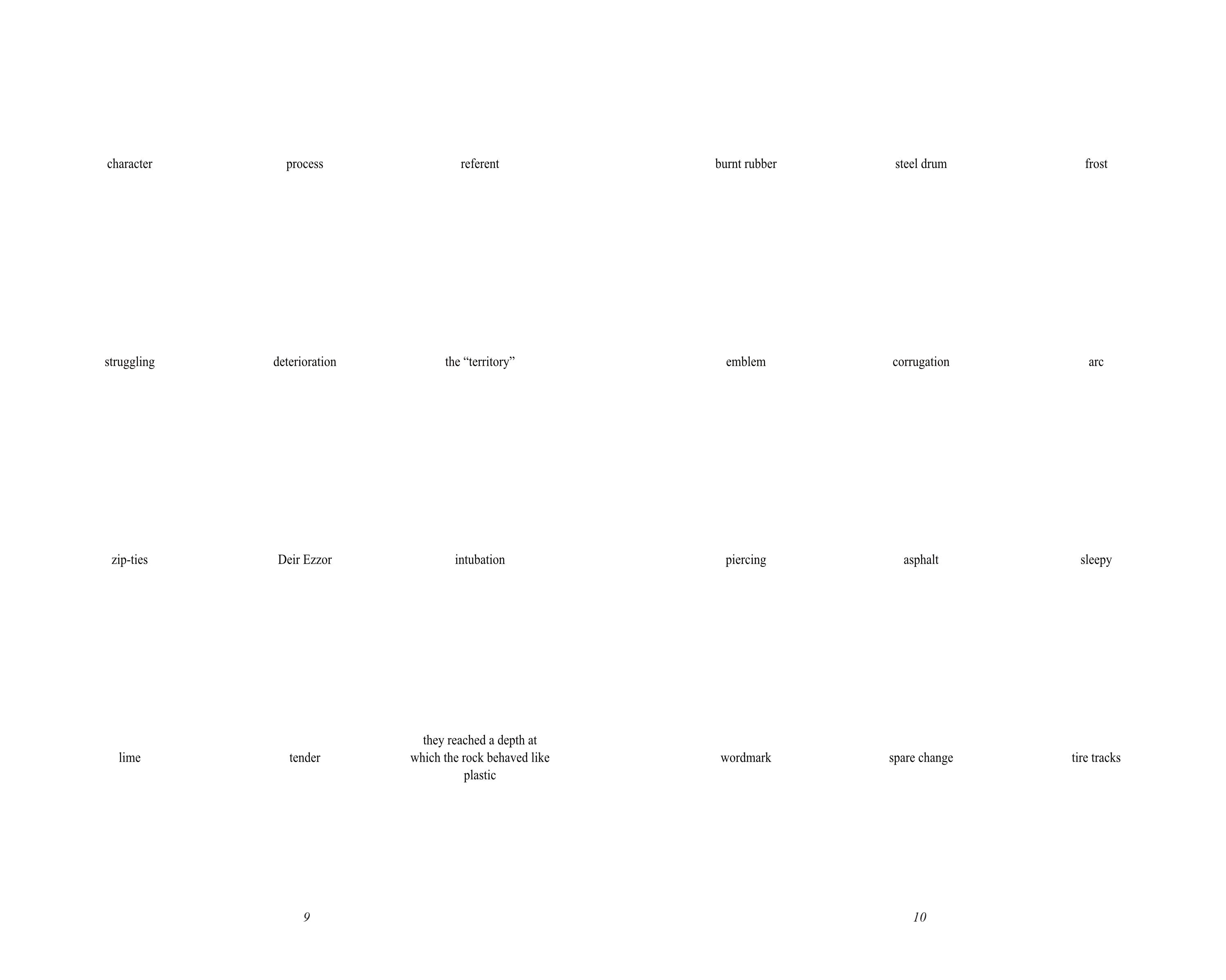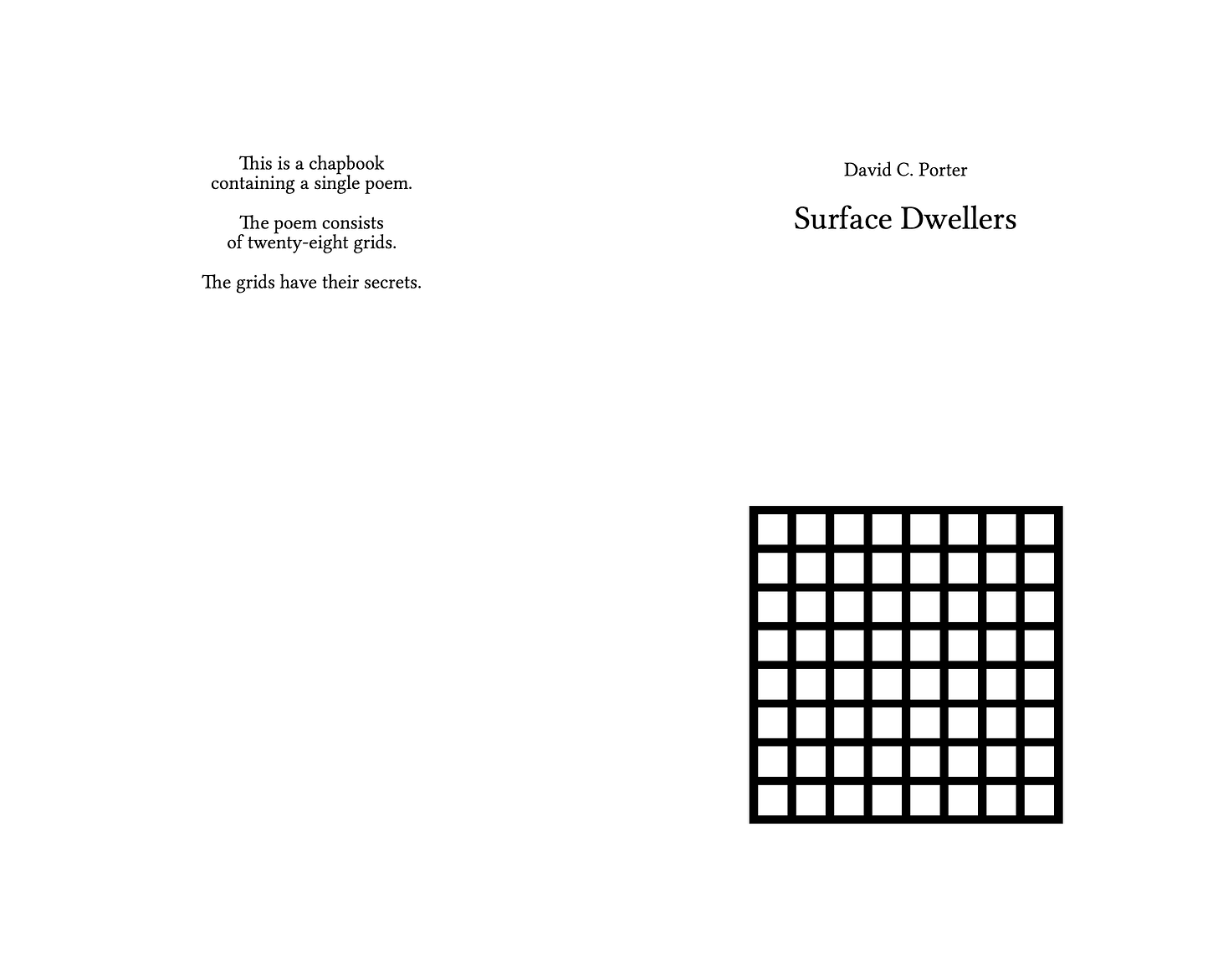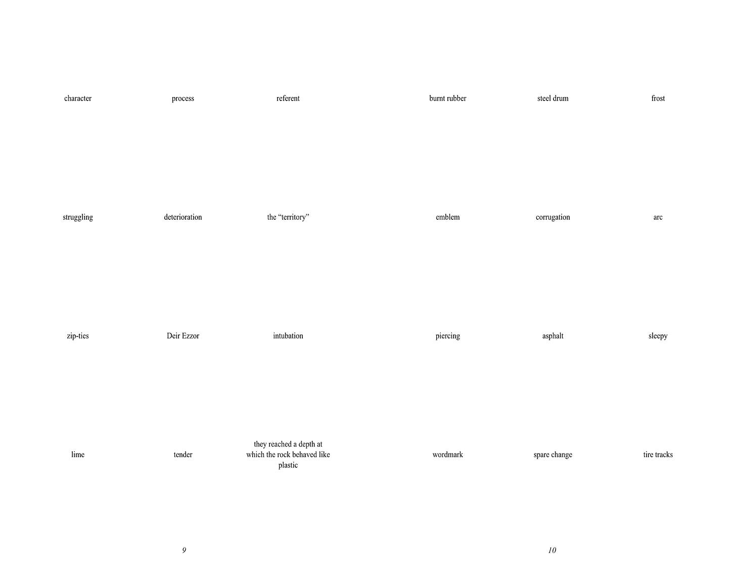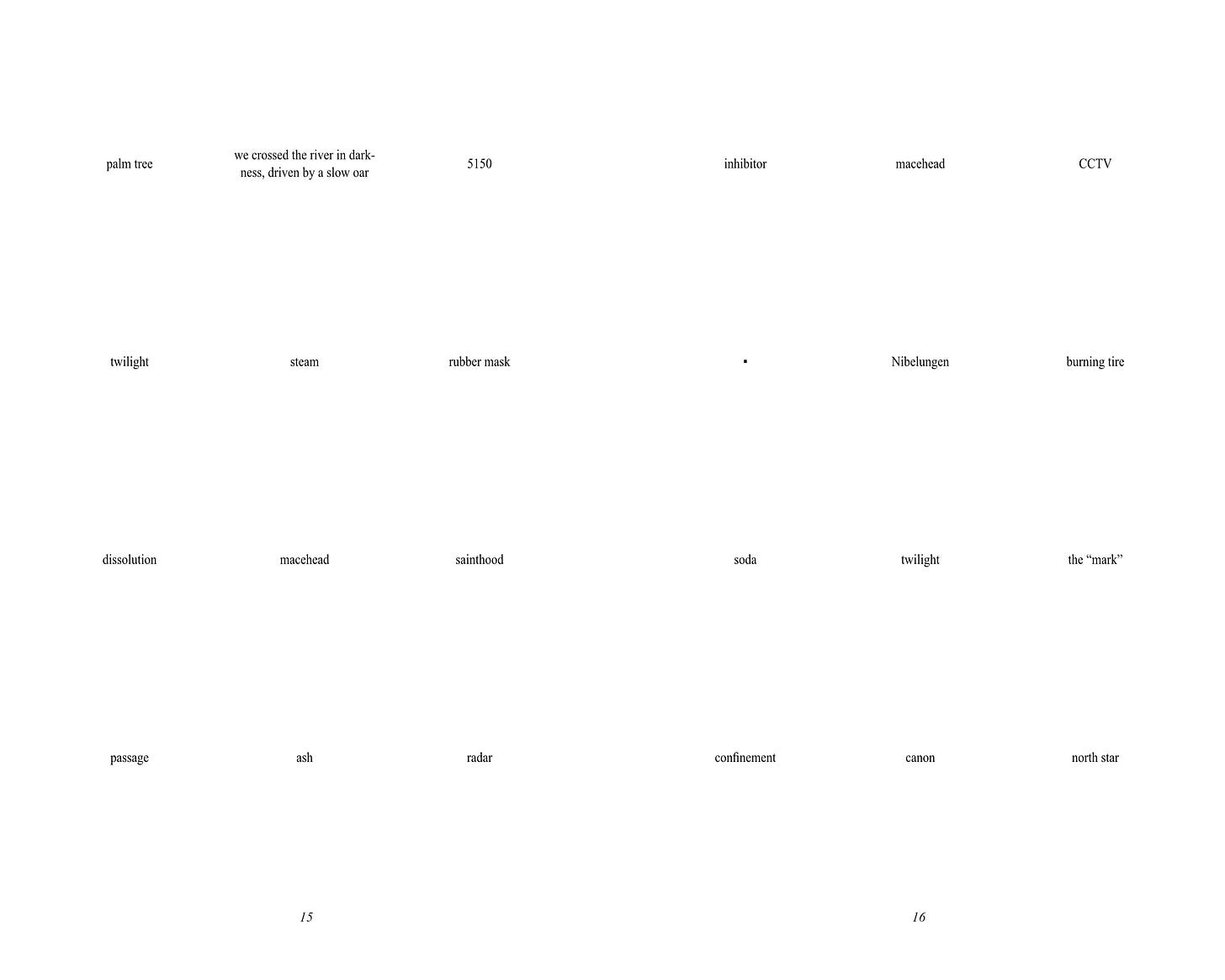 As I alluded to above, part of why I self-publish work is to not have to describe or explain it, but I suppose I should put down a few words about Surface Dwellers, given I’m asking you to give me money for it. The work (which I conceptualize as a poem, but that doesn’t mean you have to) takes the form of a series of semantic “grids”, measuring three units across by four down. Each unit consists of a word, phrase, sentence, black dot, or (increasingly towards the end of the text) a blank space. This structure produces dense, overlapping textual relationships across multiple axes (row, column, page, etc.), relationships which both produce and dissolve meaning as-such. Certain words and ideas reappear, many do not. There is a political dimension to it, but there are other dimensions, as well. I am sketching this in very abstract terms not only because of my aversion to explication (if I could express what I wanted to express with Surface Dwellers in a more straightforward way, I would have done so), but also because I composed it, for the most part, almost a year ago, and in the interim many of its references have become cryptic even to me; I know that they are not arbitrary, that there is a purpose to them, but I no longer remember what exact purpose that is. The grids have their secrets.