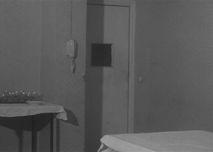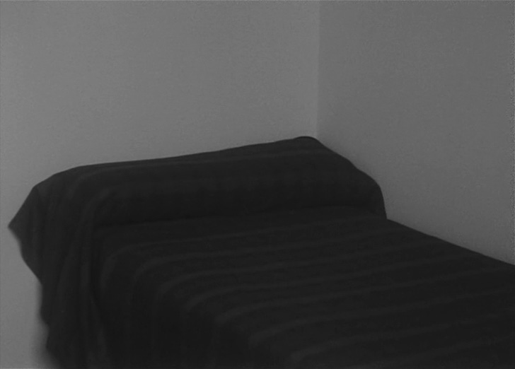 There is a particular technique which I think exemplifies this. It’s utilized in certain scenes which either follows some action from the common area of the guesthouse to one of the private rooms, or vice-versa. In either case, these sequences begin and end as locked-down shots of figures imprisoned within the hard-edged geometry of the guesthouse’s barren interior, as cold and precise as anything Duras, or Antonioni, or Robbe-Grillet had done up until then (perhaps not as cold and precise as Bresson, but then, what is?). Between these two images, however, at the point in the scene where the action shifts from one location to the other, there is something different: not a simple cut, nor a pan, nor a smooth, gliding tracking shot, but rather the camera being slightly awkwardly, unmistakably picked up and carried, moving sideways in space, its gaze remaining fixed ahead, then placed back down at the second location. What we have in these sequences is a situation in which the boundary of the proscenium is not transgressed, but in which the bodily presence of the filmmaker is nevertheless made known – made known because it had to be made known, because, with such limited resources, it was the only way in which such a shot could be achieved, and because Contactos is a film which is, in a sense, about nothing else except picking a camera up, and doing what is necessary to achieve what must be achieved.